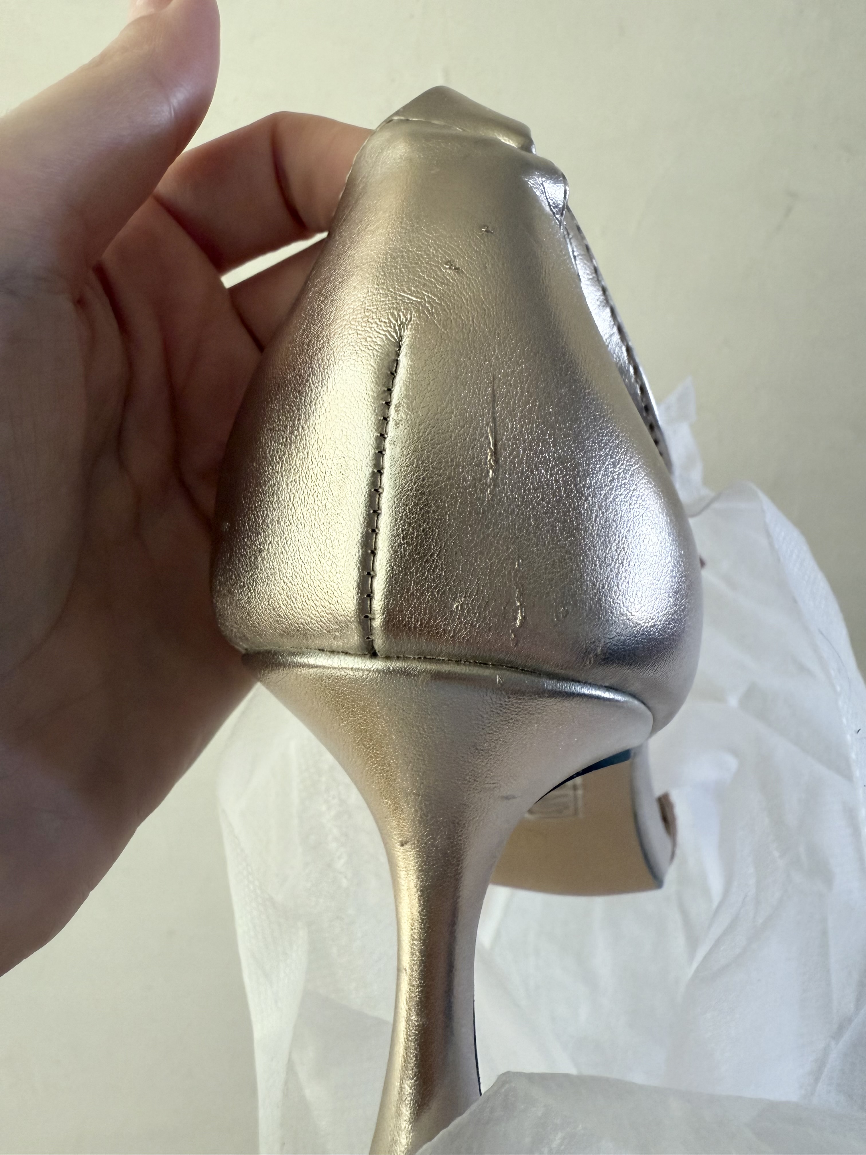پاشنه: ۱۰ سانت ،❌پشت کفش داخل بار از چند قسمت خراش برداشته .❌